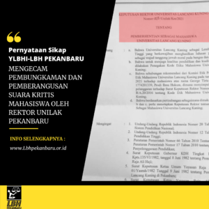 Flyer Pernyataan sikap Do mahasiswa unilak 24 Februari 2021106 Views1 Min Read lbhpekanbaru Add Comment Share This! FacebookXPinterestLinkedIn You may also like Siaran Pers Kekerasan Terjadi Lagi Pada Warga Rempang, Polresta Barelang Tolak Laporan 7 bulan ago Siaran Pers BP Batam Masih Terus Menggusur Paksa Warga Rempang; Hentikan Proyek Yang Menyengsarakan Rakyat 7 bulan ago Siaran Pers Tim Advokasi Desak KY Proses Laporan Dugaan Pelanggaran Etik Hakim Kasus Rempang 4 Oktober 2024 Catatan Akhir Tahun CATATAN AKHIR TAHUN YLBHI-LBH PEKANBARU 2023 : JALAN NESTAPA MEREBUT DEMOKRASI 13 Agustus 2024 Siaran Pers JALAN RUSAK MEMAKAN KORBAN!! PEMERINTAH KEMANA? 5 Juli 2024 Publikasi • Siaran Pers DLHK KOTA PEKANBARU PECAT 8 PEKERJA: HAK BURUH DIINJAK! 26 Juni 2024 Siaran Pers Rektor Unri Cabut Laporan: Bukan Jaminan Khariq Anhar Bebas dari Diskriminasi dan Intimidasi Di Kampus 13 Mei 2024 Siaran Pers Menjemput Kebebasan, Perjuangan Akan Tetap Berlanjut 2 April 2024 Siaran Pers Segera Hentikan Aktivitas Pertambangan Batubara PT. Bara Prima Pratama di di Desa Batu Ampar, Kab. Indragiri Hilir, Provinsi Riau. 12 Februari 2024 Siaran Pers Lawan Praktik Pembungkaman Kedaulatan Rakyat! LBH YLBHI: Buka Posko Advokasi Selamatkan Demokrasi 12 Februari 2024 Siaran Pers BP Batam Bentuk Tim Terpadu dan Satgas: Upaya Untuk Menakut-Nakuti Warga Rempang 9 Januari 2024 Siaran Pers • Tak Berkategori Siaran Pers: Malam Tahun Baru 2024, Warga Rempang Menyerukan Penolakan Relokasi Dan Pembangunan Rempang Eco City 1 Januari 2024 Berita • Siaran Pers Hentikan Pelarangan dan Represi Perayaan Natal dan Tahun Baru 2024 25 Desember 2023 Siaran Pers TEBANG PILIH PENEGAKAN HUKUM: PETANI DI CAP PENJAHAT LINGKUNGAN 20 Desember 2023 Siaran Pers TUNTASKAN SELURUH PELANGGARAN HAM DI BUMI PERTIWI HAM MILIK KITA : HAM UNTUK SEMUA 18 Desember 2023 Siaran Pers Pengerjaan Proyek Tidak Profesional, Walikota Harus Segera Memperbaiki Jalan Rusak Kota Pekanbaru 18 Desember 2023 Siaran Pers Peringatan Hari HAM Internasional Perampasan Ruang Hidup di Provinsi Riau 14 Desember 2023 Siaran Pers LBH Pekanbaru Mengecam Dugaan Perbudakan Modern Di PT. SRL Rupat 5 Desember 2023 Siaran Pers Siaran pers Tim Advokasi untuk Kemanusiaan – Barelang (YLBHI-LBH Pekanbaru, LBH Mawar Saron Batam dan PBH Peradi Batam) 13 September 2023 Siaran Pers Siaran Pers: “Tim Advokasi Untuk Kemanusiaan – Rempang” 11 September 2023 Berita • Siaran Pers Jangan ada PLTU baru, STuEB serahkan “Policy Brief” transisi energi ke JETP 16 Agustus 2023 Siaran Pers “Katakan Suku Talang Mamak Belum Diakui, PT Era Perkasa Mining Harus Minta Maaf!” 16 Agustus 2023 Berita • Publikasi • Siaran Pers Akhirnya Anak-Anak Warga Okura Bisa Sekolah, Sistem Zonasi PPDB Harus Diperbaiki” 15 Agustus 2023 Berita • Siaran Pers “Sistem Zonasi Bermasalah, Anak-anak Warga Okura Pekanbaru Terancam Tidak Bisa Bersekolah” 7 Agustus 2023 Siaran Pers Kekerasan Pendamping Korban KS di Unri : Memastikan Ruang Keadilan dan Perlindungan bagi Pendamping Korban di Pengadilan 4 Juli 2023 Siaran Pers LBH Pekanbaru Buka Posko Pengaduan THR 2023, Pengusaha Wajib Bayar THR ! 12 April 2023 Siaran Pers Alumni Sekolah Energi Bersih LBH Pekanbaru menyoroti kerusakan Sungai Siak yang semakin tercemar 30 Oktober 2021 Kalabahu • Publikasi • Siaran Pers KALABAHU IV “Merebut Masa Depan Dari Cengkraman Oligarki” 5 Juli 2021 Berita • Publikasi • Siaran Pers Bongku Bebas di Tengah Covid-19 12 Juni 2020 Siaran Pers Tiga Petani Bunga Raya Menolak Dikambing Hitamkan: JPU Hadirkan 11 Saksi dan Gagal Buktikan Dakwaannya! 3 hari ago Siaran Pers EKSEPSI DITOLAK SELURUHNY, HAK ASASI 3 PETANI BUNGA RAYA TERKOBANKAN 2 minggu ago Siaran Pers Dakwaan Penuntut Umum Melanggengkan Pembungkaman : Stop Kriminalisasi Petani Bunga Raya! 1 bulan ago About the authorView All Posts lbhpekanbaru Add Comment Click here to post a comment Cancel replyCommentNama * Email * Situs Web Comment Share This! FacebookXPinterestLinkedIn Topics Berita60 Catatan Akhir Tahun7 Dokumen5 Kalabahu16 KERTAS POSISI2 Opini11 Publikasi83 Siaran Pers109 Tak Berkategori43 Featured Siaran Pers Tiga Petani Bunga Raya Menolak Dikambing Hitamkan: JPU Hadirkan 11 Saksi dan Gagal Buktikan Dakwaannya! Siaran Pers EKSEPSI DITOLAK SELURUHNY, HAK ASASI 3 PETANI BUNGA RAYA TERKOBANKAN Siaran Pers Dakwaan Penuntut Umum Melanggengkan Pembungkaman : Stop Kriminalisasi Petani Bunga Raya! Opini Tinjauan Kepatuhan Pengendara Bermotor Terhadap Lampu Lalu Lintas Dikaitkan Dengan Undang-Undang Nomor 22 Tahun 2009 Tentang Lalu Lintas dan Angkutan Jalan (Studi Kasus Harapan Raya Pekanbaru) Tak Berkategori EFEKTIVITAS FUNGSI TROTOAR BAGI PELARI SORE DI JALAN DIPONEGORO KOTA PEKANBARU DITINJAU DARI PERSPEKTIF PERATURAN PERUNDANG-UNDANGAN